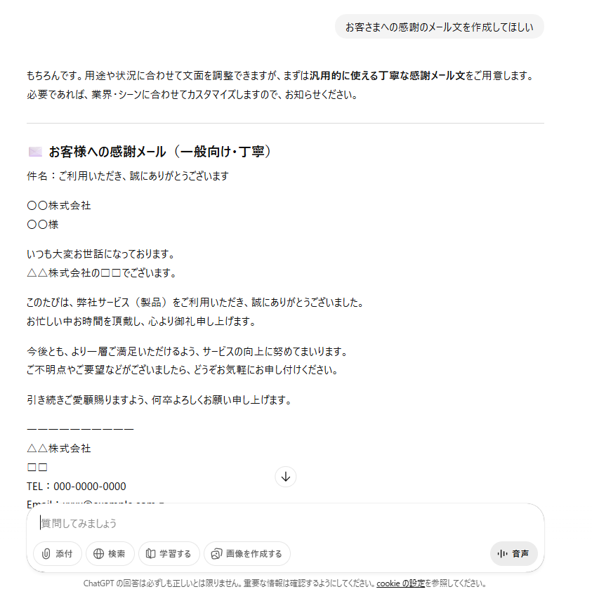 慣れてきたら、「お客様への感謝のメール文を作って」「SNS投稿のアイデアを3つ出して」と